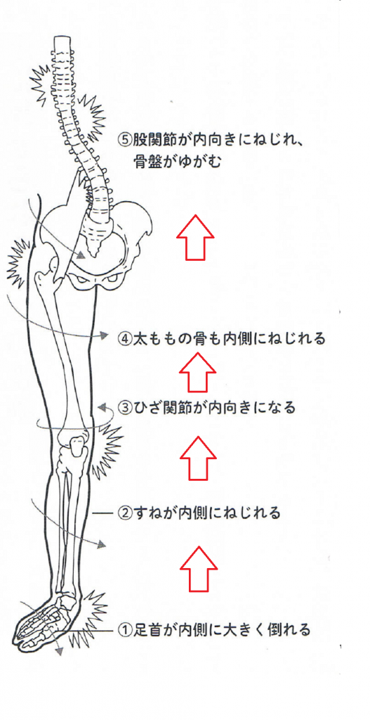 下腿(すね)が内側にねじれ,その結果,膝に負担をかけ,