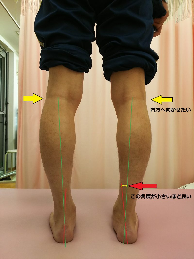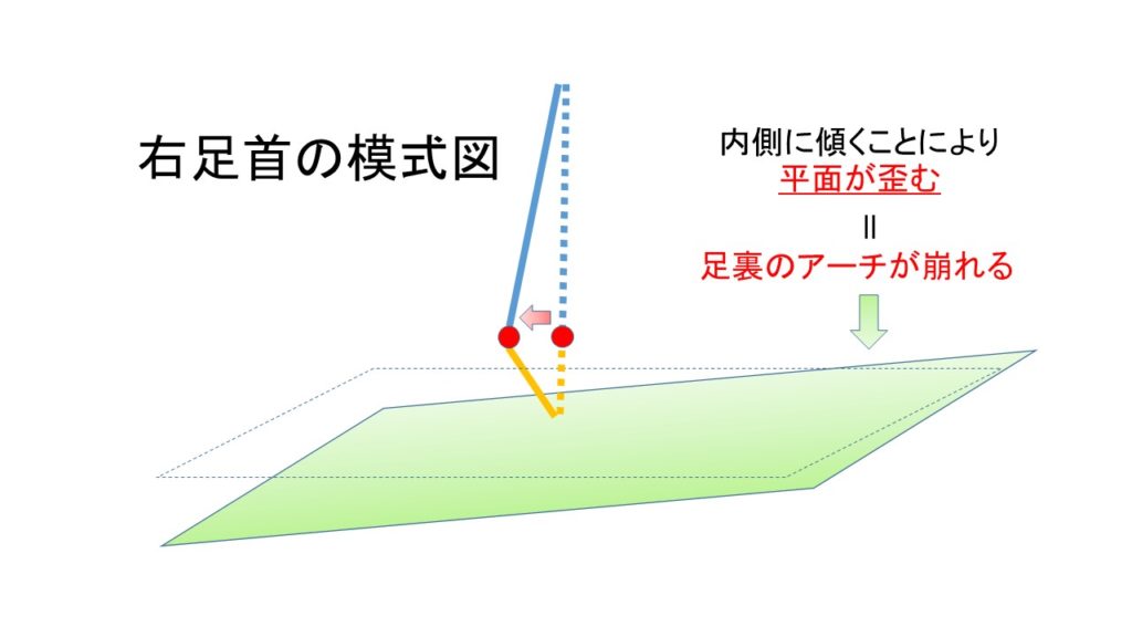 つまり,土踏まずがつぶれて,足首が内側に傾くことにより,下腿に対して踵の軸がずれています。