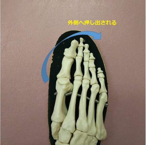 ちなみに,足のアーチが崩れて母趾が外側に押し出される仕組みは「外反母趾になる原因」に共通します。